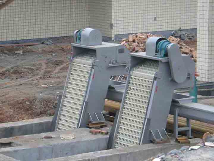 旋轉(zhuǎn)式系列格柵除污機(jī)分為不銹鋼網(wǎng)齒和非金屬齒兩種。在電機(jī)減速器的帶動下,經(jīng)鏈輪傳動,驅(qū)動耙齒鏈,進(jìn)行回轉(zhuǎn)運動。當(dāng)耙齒運轉(zhuǎn)到設(shè)備上部時,由于導(dǎo)輪和彎軌的導(dǎo)向,使每組耙齒之間產(chǎn)生相對的運動。大部分固體物質(zhì)靠重力落下,另一部分依靠轉(zhuǎn)刷軸的反向運動,可以把粘在耙齒上的雜物洗刷干凈。